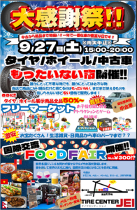 日時:9月27日(土)15:00~20:00 ※雨天中止※ 会場:タイヤセンターJEI相模原店 特設会場 ★イベント内容 ・🚗タイヤ、ホイール販売 ・🚗中古車オークション ・ὅ […]